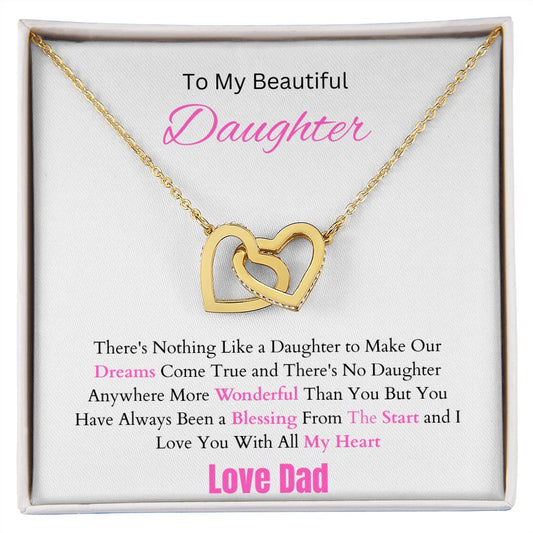 To My Beautiful Daughter--Love Dad--Pink Text-- Interlocking Hearts Necklace